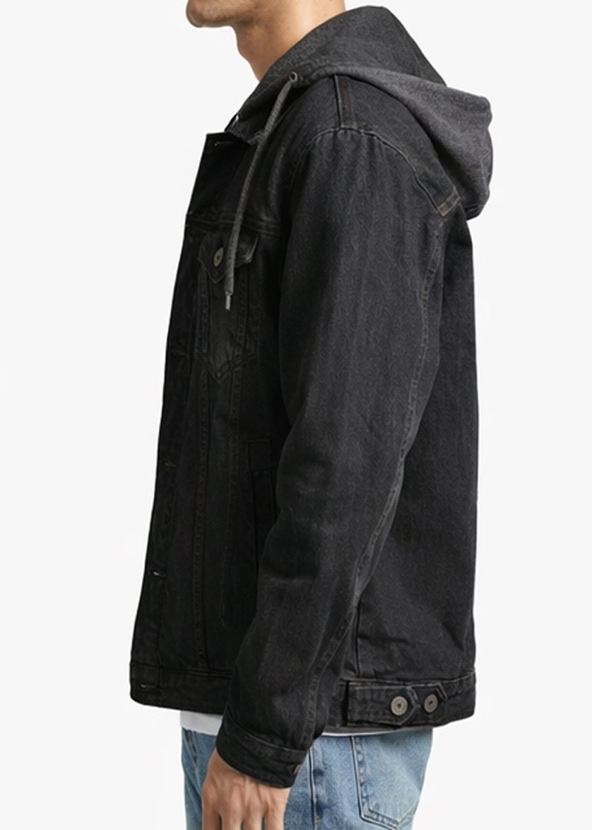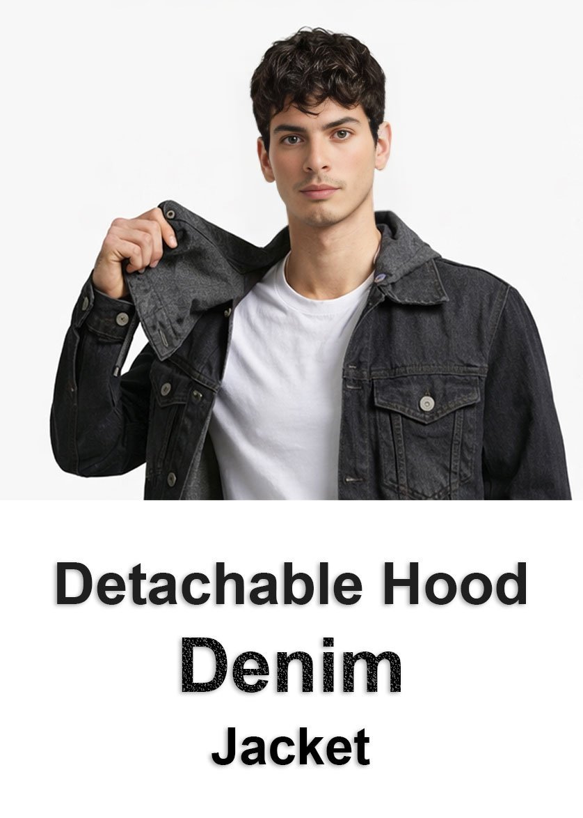 A modern black denim jacket designed with a detachable hood for versatile styling. Crafted for everyday wear, it delivers comfort, durability, and a sharp street-ready look.