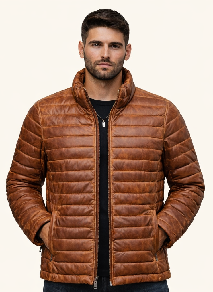 Upgrade your winter wardrobe with our Premium Quilted Leather Puffer Jacket, crafted for men who value style, comfort, and durability.