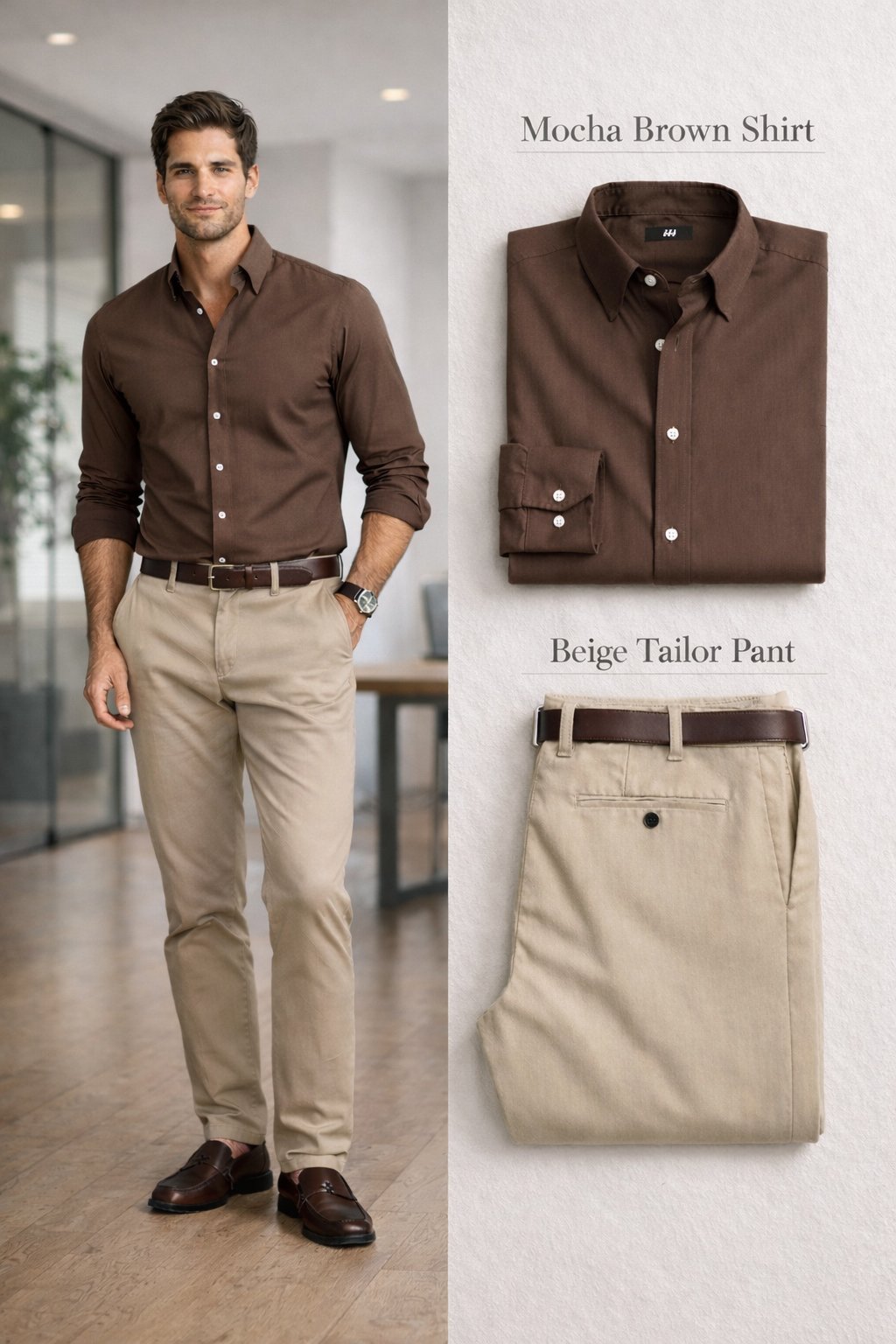 Elevate your everyday style with this refined business-casual outfit featuring a premium mocha brown cotton shirt paired with perfectly tailored beige chino pants. Designed for comfort, versatility, and modern elegance, this set delivers a clean, polished look ideal for office wear, meetings, and smart casual occasions.